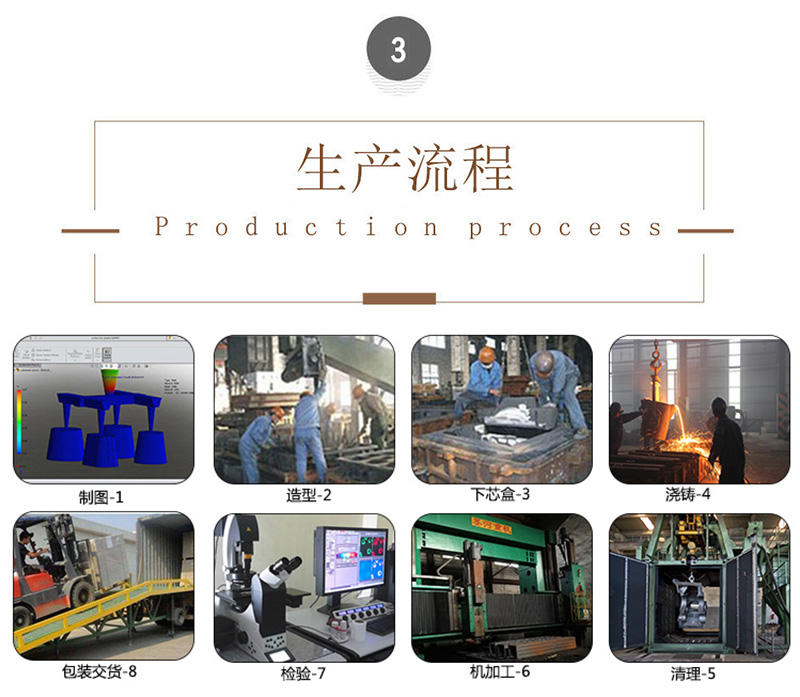 生產設備:樹脂砂鑄造、覆膜砂鑄造、失蠟鑄造、中頻電爐、爐前分析儀、退火爐等。